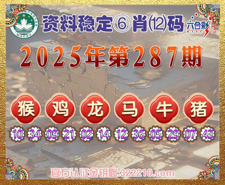 287期:《资料稳定》 ♠️⑥肖⑿码♠️【鸡龙马牛猪】开:猴34